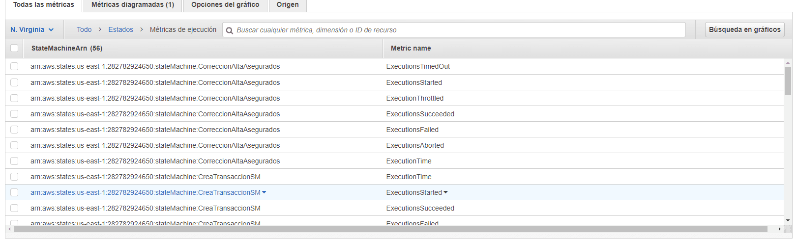 Entonces, esta es la diferencia entre definir una lambda y un StateMachine (el lambda está bajo la métrica por nombre y el StateMachine bajo la métrica por el ARN de state).