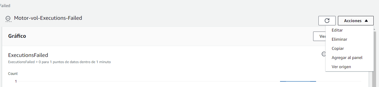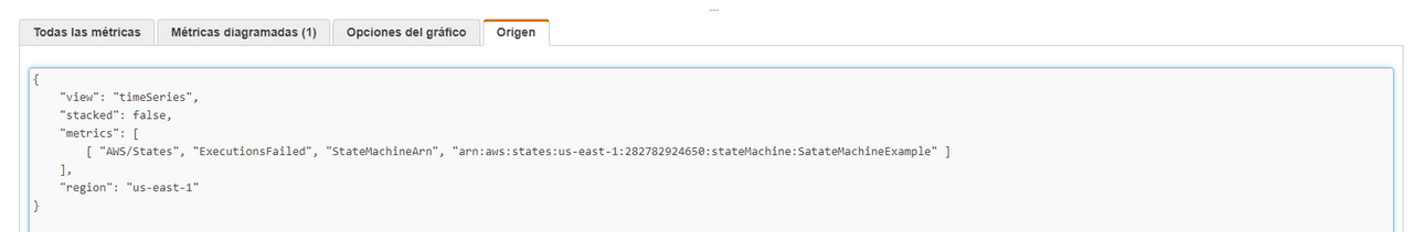 Métrica de Estados: Al igual que en las lambdas las de estados pueden ser definidas de varias formas, para este ejemplo usarás las Métricas de ejecución. Estas son: ExecutionsSucceeded, ExecutionsFailed, ExecutionsAborted, ExecutionThrottled, ExecutionsTimedOut, ExecutionsStarted y ExecutionTime. Usarás ExecutionsFailed en este ejemplo.