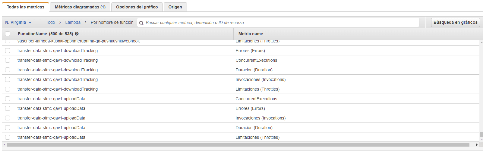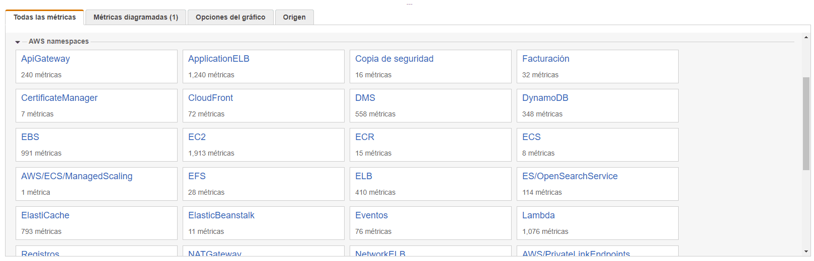 Bien ahora te puedes encontrar abrumado con la cantidad de opciones, pero, para continuar con el ejemplo buscaremos una métrica en particular, aunque como puedes observar en la siguiente imagen, prácticamente cualquier recurso se puede monitorear, como las llamadas a una API en API Gateway, la capacidad de una tabla en DynamoDB o número de mensajes notificados a través de SNS.