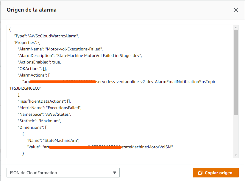 ✅ Sobre el nombre y el valor, se debe considerar que cuando la alarma se define por nombre, el Name puedes dárselo tu a tu elección y el Value debe ser exacto el nombre del recurso, en este caso el Lambda. Sin embargo, en caso de usar arn como Value, el Name debe ser el nombre del recurso mas el arn, en este caso es StateMachineArn. Esta regla puede variar, pero si quieres estar seguro, crea la alarma directamente en la consola a modo de prueba y en ve en Acciones presiona Ver origen.