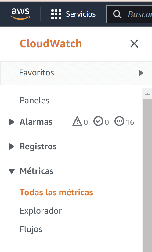 El primer paso es navegar en el mar de posibilidades en cuanto a métricas en CloudWatch, para eso desde la consola podemos ir directamente a CloudWatch, una vez ahí buscar en el panel la sección de Métricas, luego a Todas las métricas.
