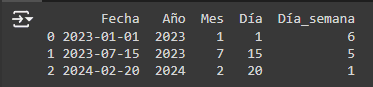 1. Creación de características a partir de fechas Las fechas pueden descomponerse en múltiples características como año, mes, día, día de la semana, etc., lo cual puede ser útil para capturar patrones estacionales o tendencias a lo largo del tiempo.