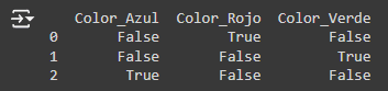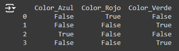 2. Codificación One-hot (One-Hot Encoding) La codificación One-hot convierte cada categoría en una nueva columna y asigna un 1 ó 0 (Verdadero/Falso). Es ideal para variables nominales sin un orden inherente.